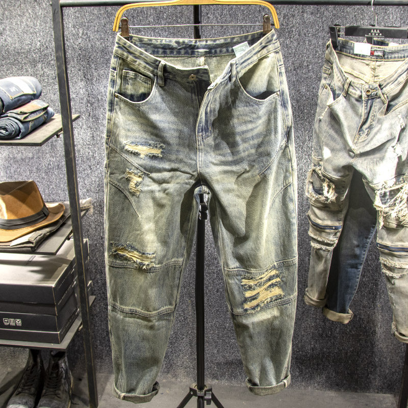 2025美式休闲痞帅补丁破洞牛仔裤男宽松潮牌街头个性束脚长裤子