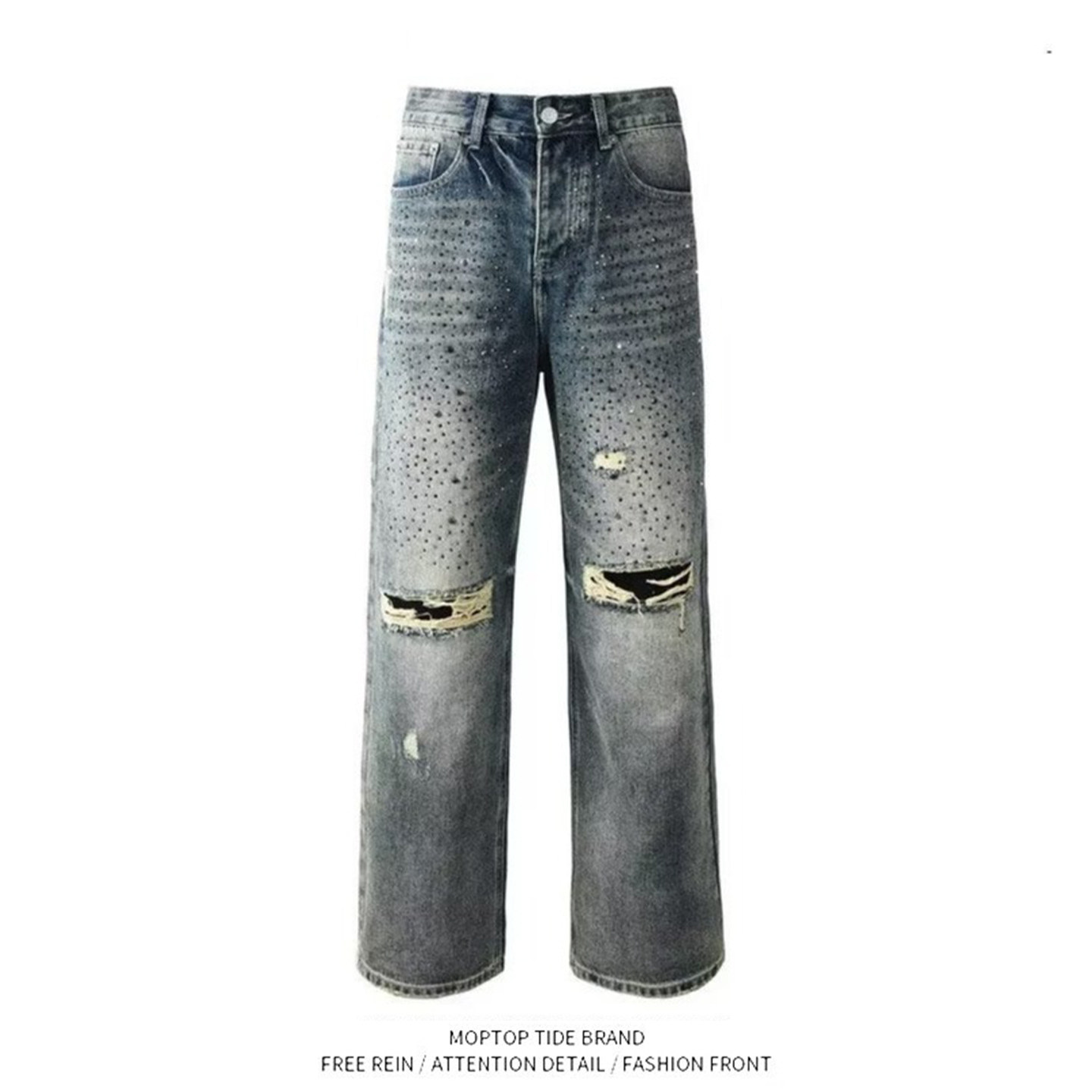 美式复古水洗破洞牛仔裤男宽松直筒阔腿裤高街痞帅钉珠弯刀长裤子