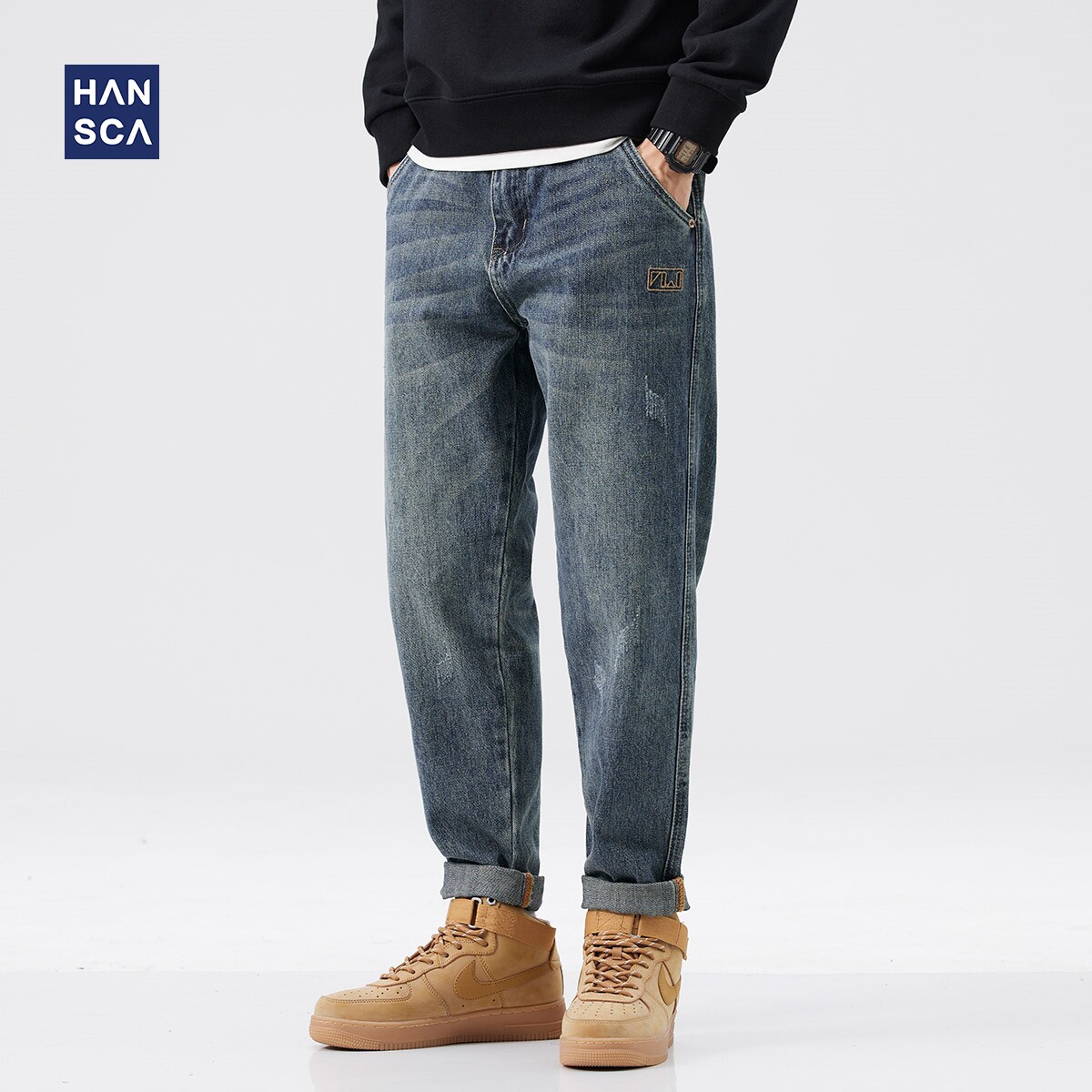 hansca破洞牛仔裤男宽松大码秋冬季潮牌时尚刺绣休闲复古锥形长裤