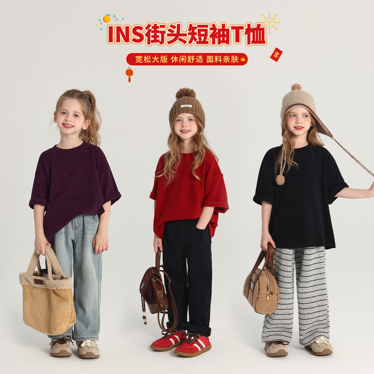 布丁哈鲁冬装女童拜年打底衫2025秋冬季新款儿童圆领红色短袖T恤