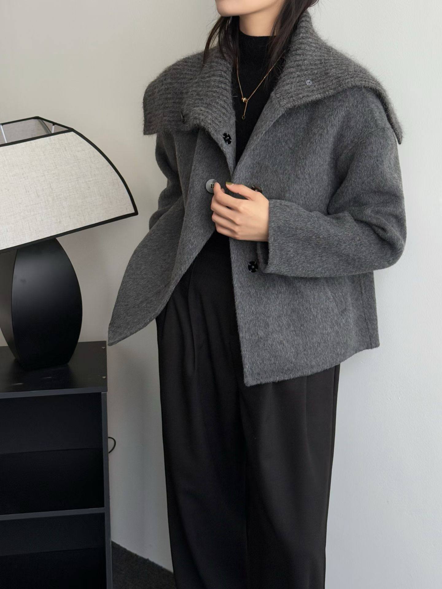 拼接针织领双面羊绒大衣新款短款设计感双面羊毛大衣休闲毛呢外套