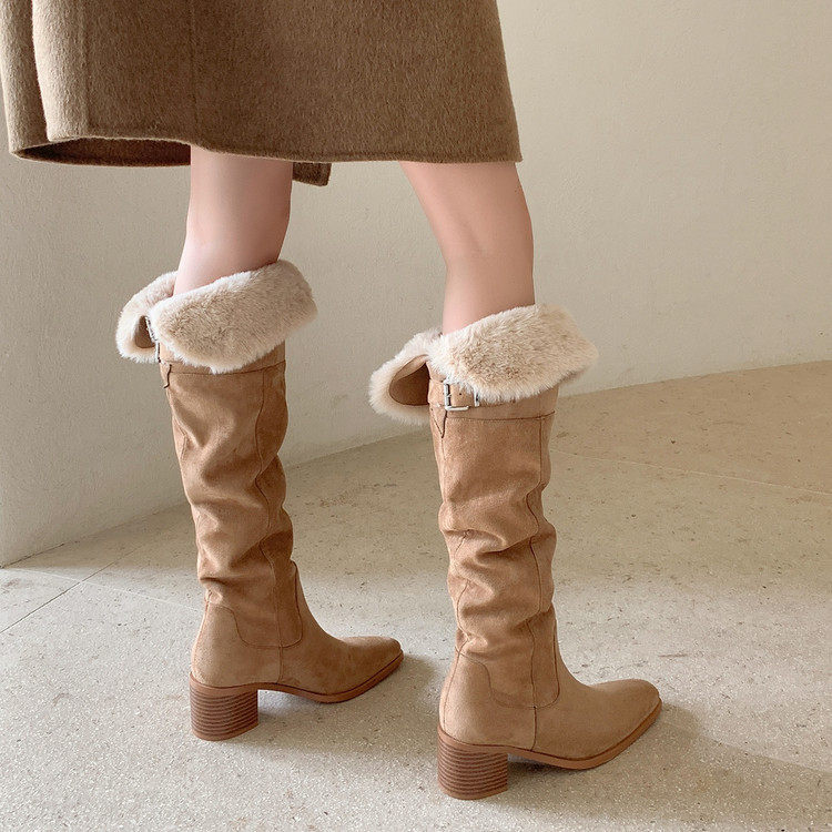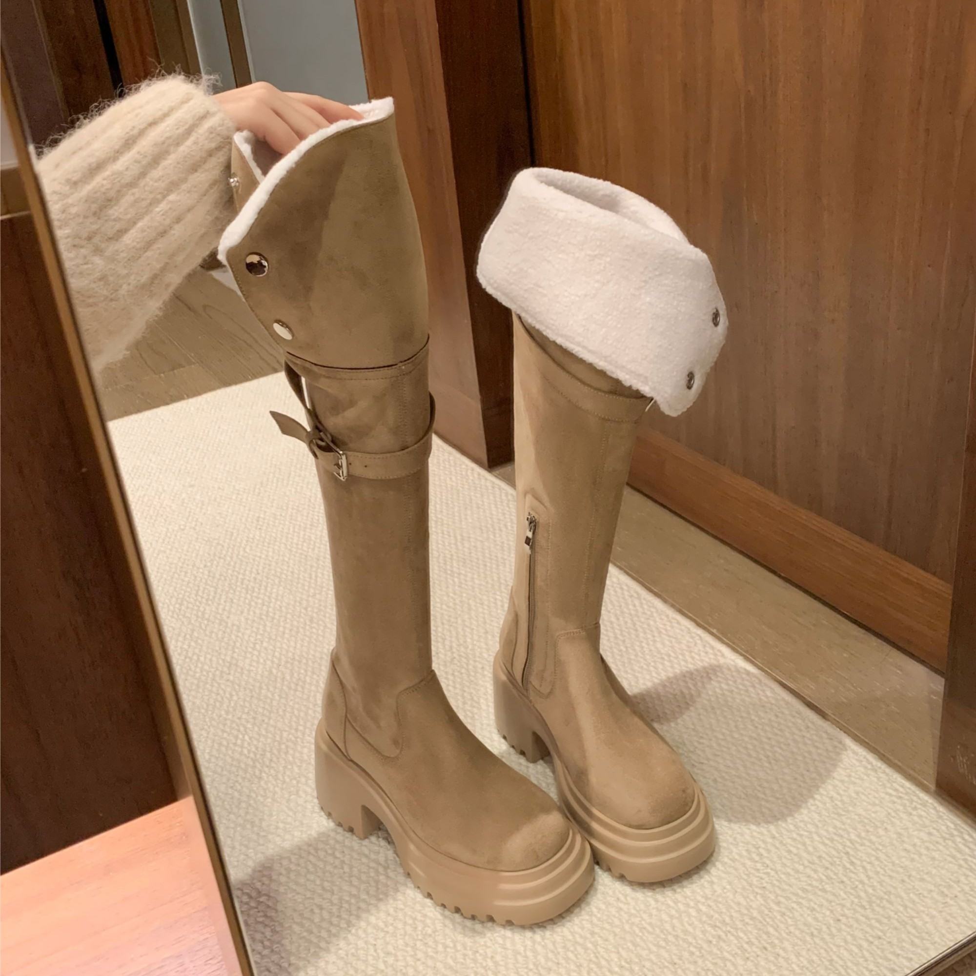 【千寻好物】苏茵茵8cm厚底~羊羔毛毛粗跟中高筒靴过膝靴女弹力靴