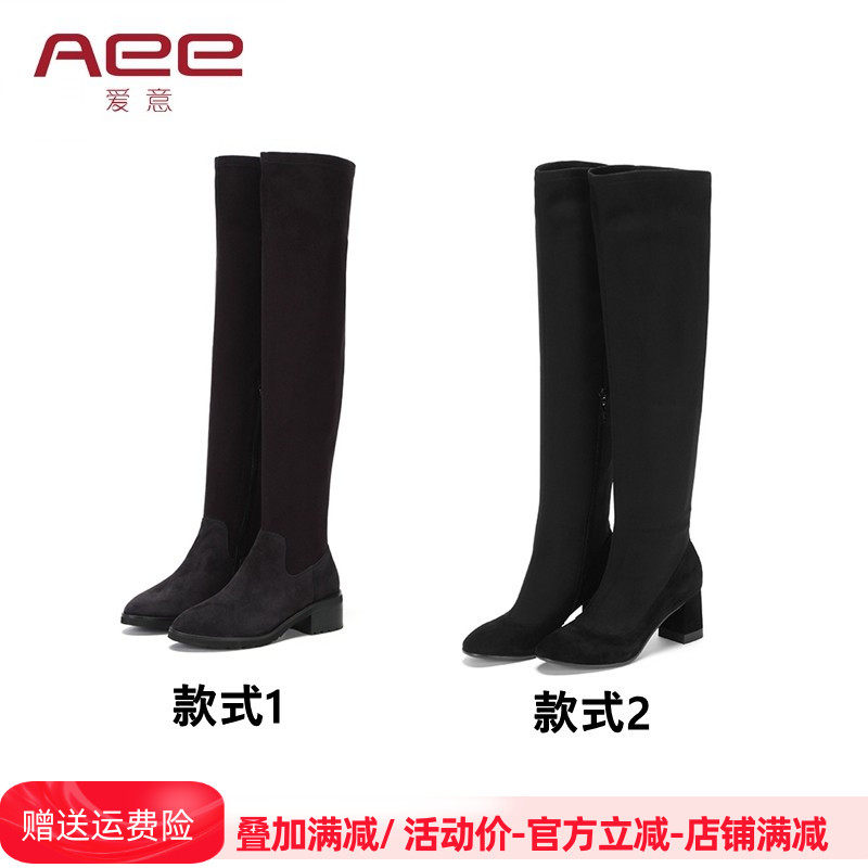 Aee/爱意冬季长靴圆头羊皮拼接弹力靴女靴高筒靴过膝靴1617505030