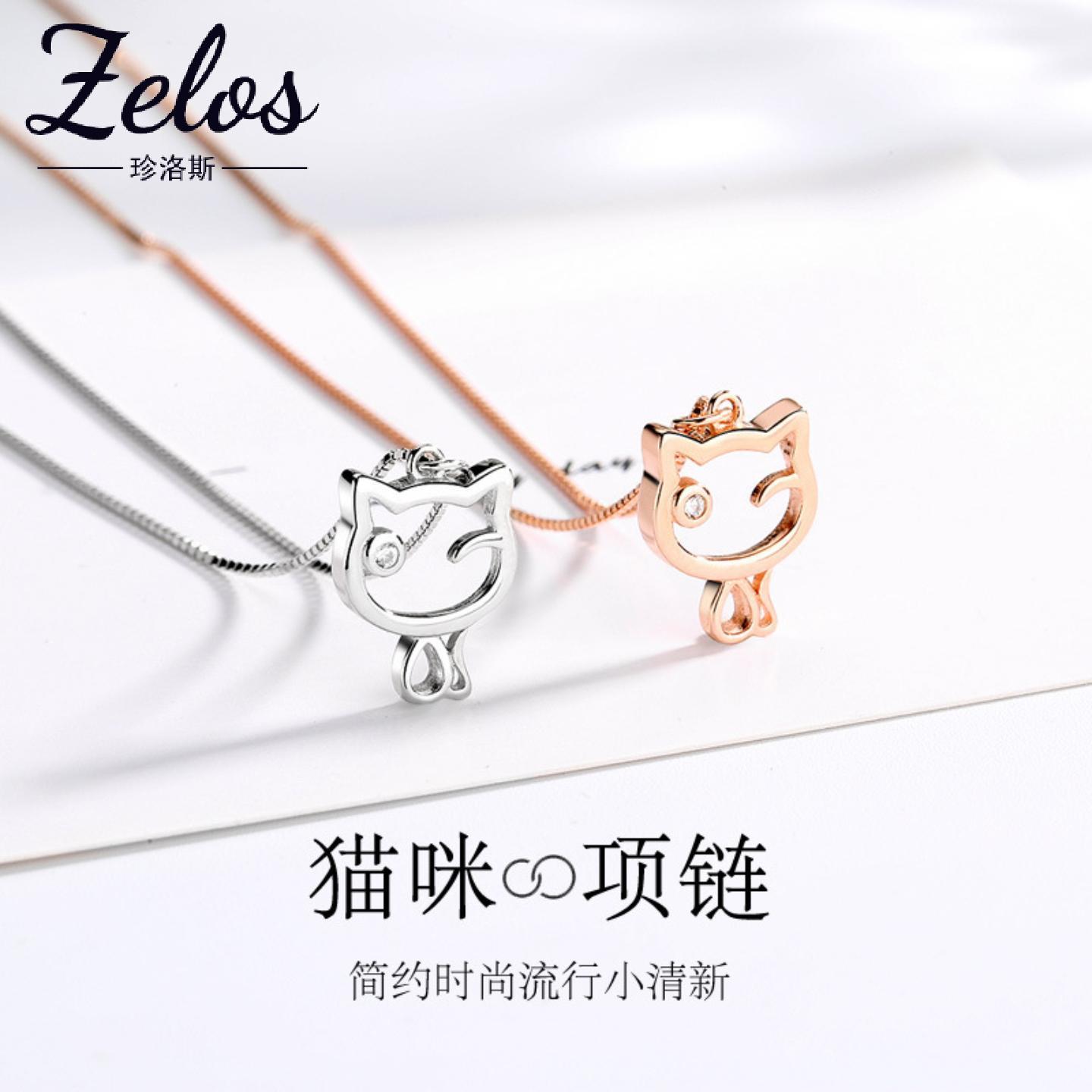 s925纯银项链女日韩风猫咪吊坠简约少女心盒子链锁骨链情人节礼物