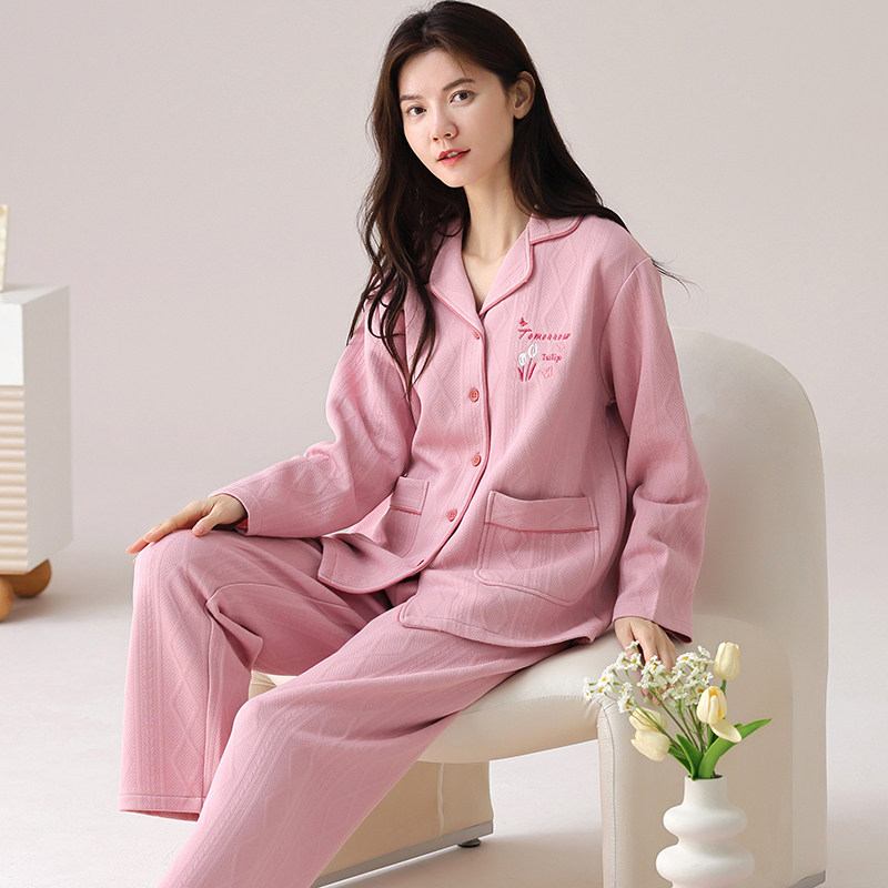 芬腾可安秋冬季女士睡衣纯棉长袖空气棉夹层全棉可外穿高档家居服