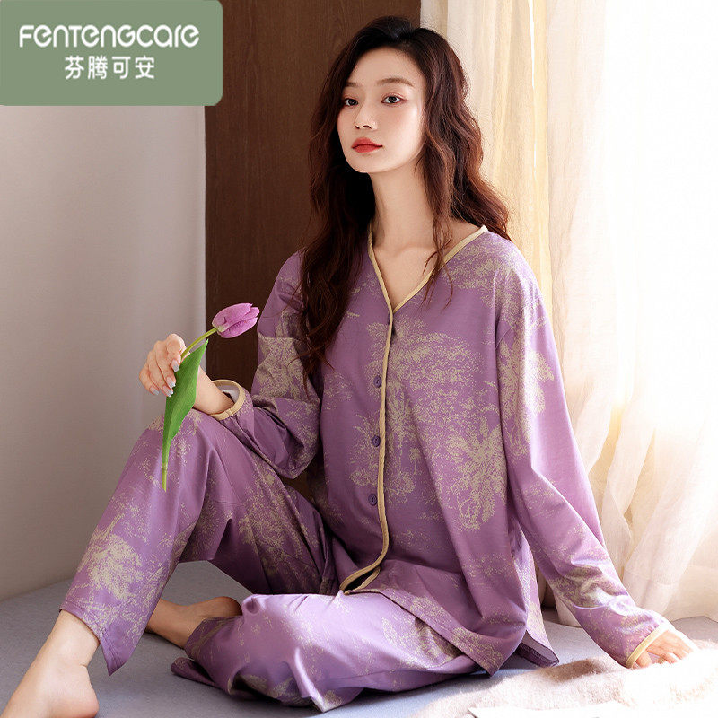 芬腾女士睡衣纯棉长袖长裤春秋季舒适休闲开衫大码家居服套装秋天