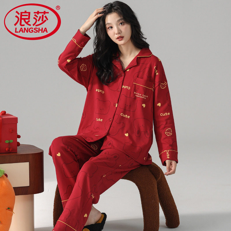 浪莎春秋款女士睡衣纯棉长袖大红色2025秋季新款本命年家居服套装