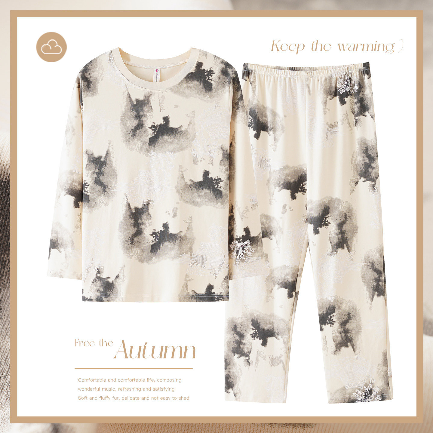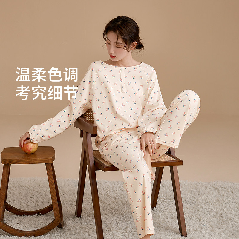 芬腾可安春秋季女士睡衣纯棉长袖高级感中年妈妈圆领可外穿家居服