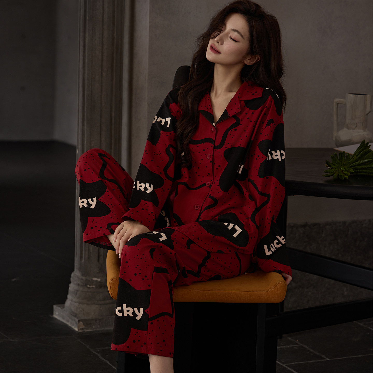 芬腾可安春秋女士睡衣纯棉长袖100全棉少女爱心本命年红色家居服