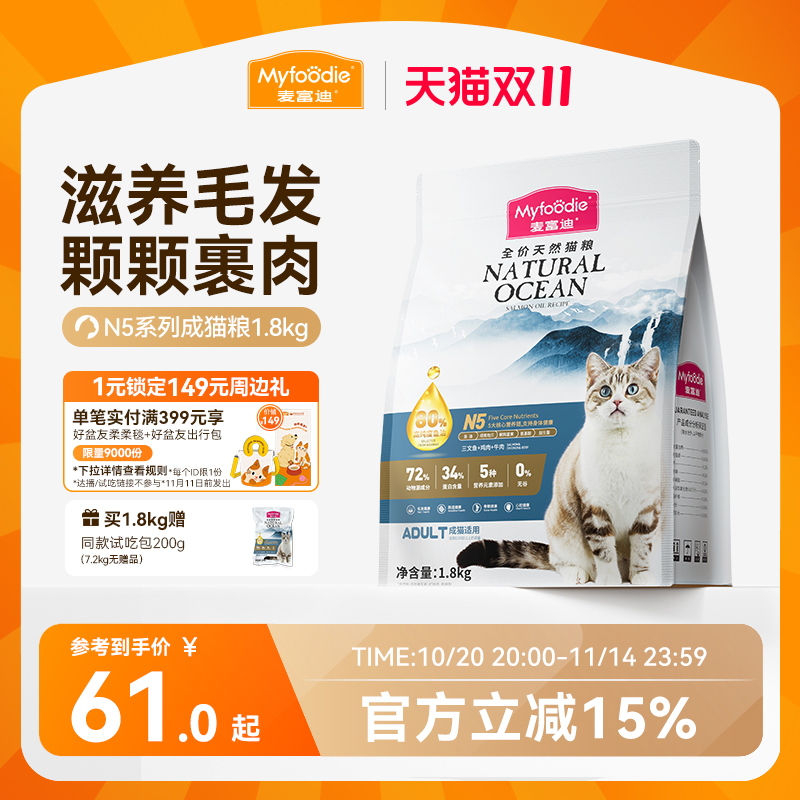 麦富迪N5鱼油猫粮官方旗舰店正品成猫营养无谷通用天然猫粮1.8kg