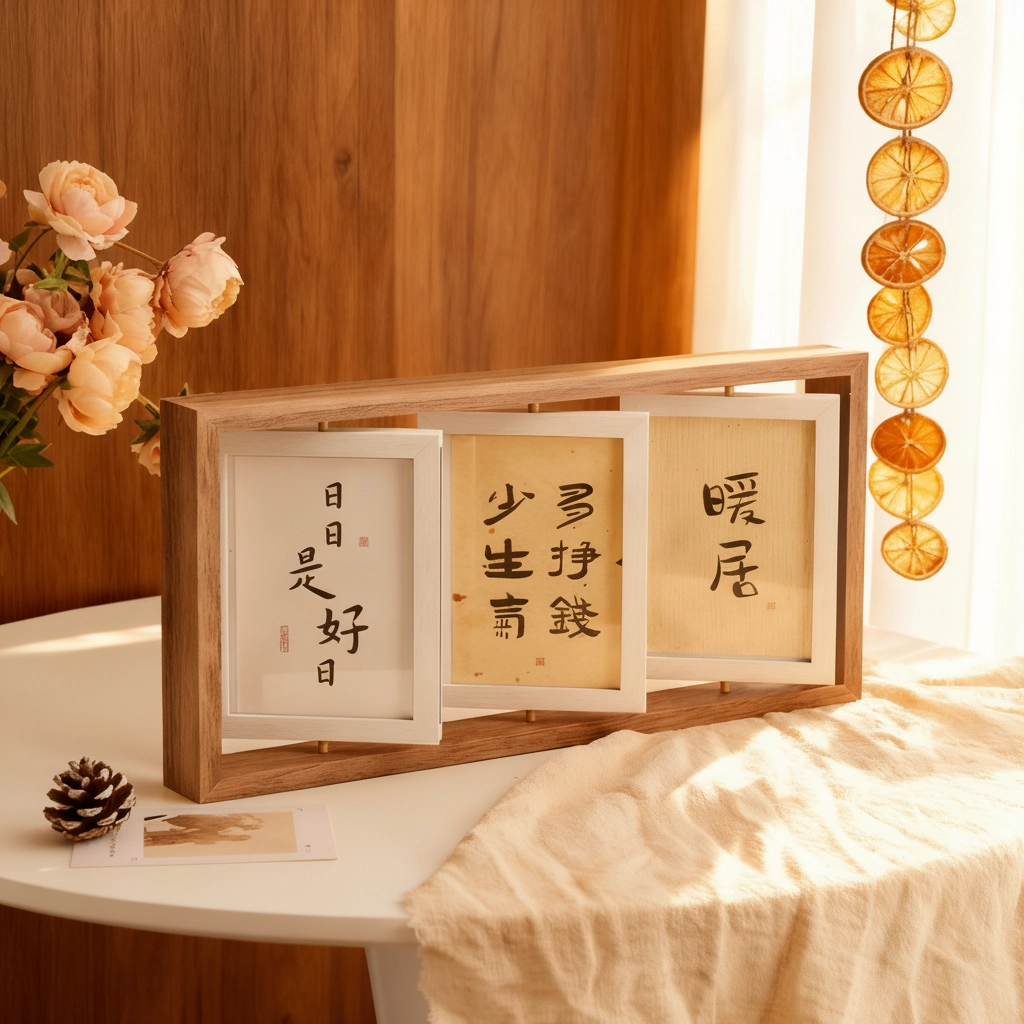 创意连体组合折叠相框摆台两联三联6寸7寸8寸木质三折相框原木色