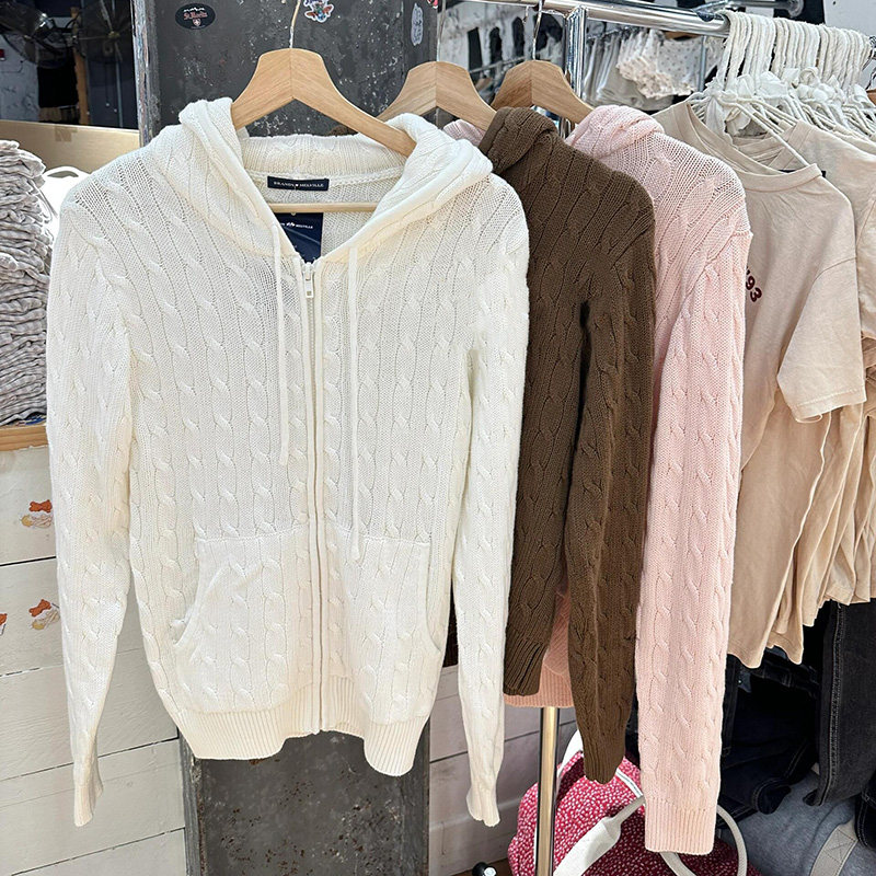 BM官网秋冬新款浅粉麻花连帽开衫毛衣bm百搭拉链外套针织上衣女潮