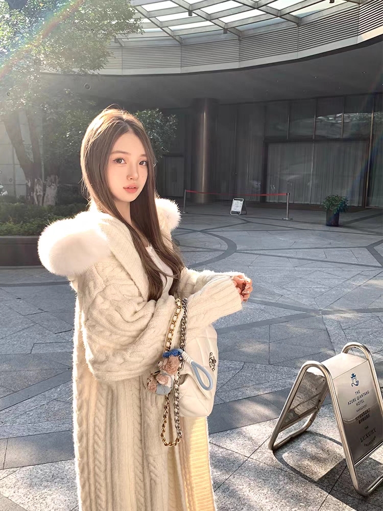Adan 连帽仿水貂毛开衫时尚韩版加厚保暖宽松百搭长款毛衣外套女