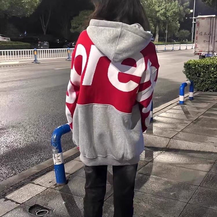 日系潮牌字母印花拼色连帽卫衣女秋冬加绒加厚慵懒风百搭情侣外套