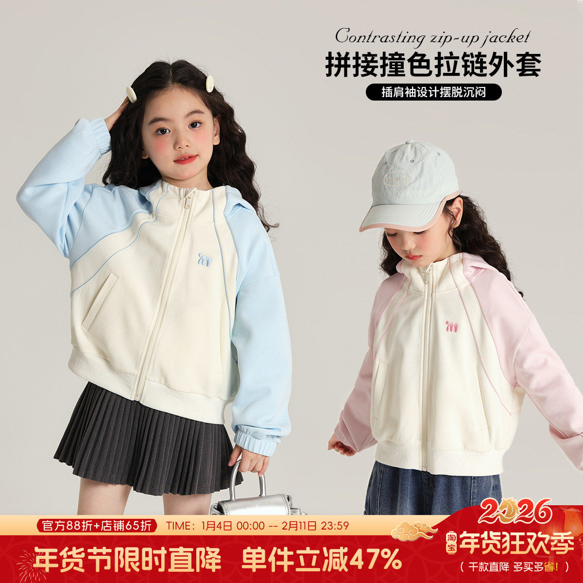 布丁哈鲁童装春装女童洋气2026春秋新款儿童拼色连帽卫衣休闲外套