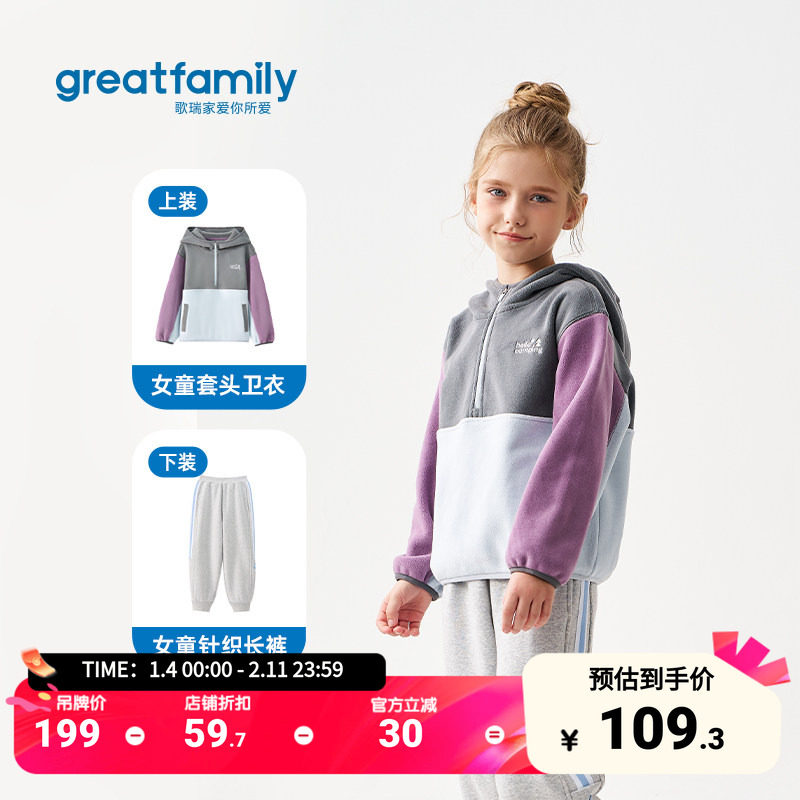 歌瑞家女童卫衣2025冬款拼色时尚百搭卡通印花连帽加绒保暖上衣