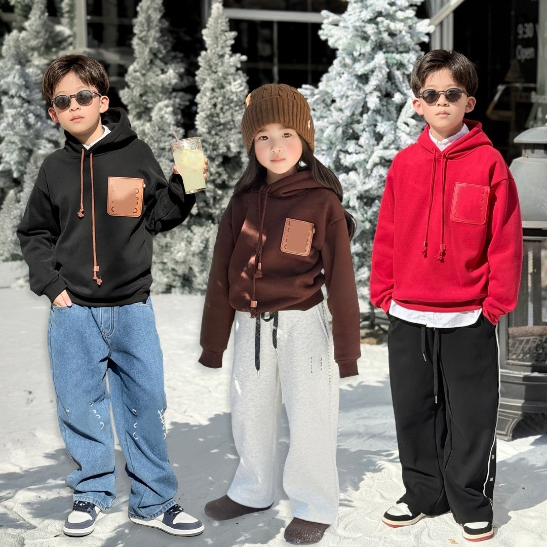 26春新皮袋拼色加绒一体绒连帽卫衣韩式休闲风男女童宽松上衣外套