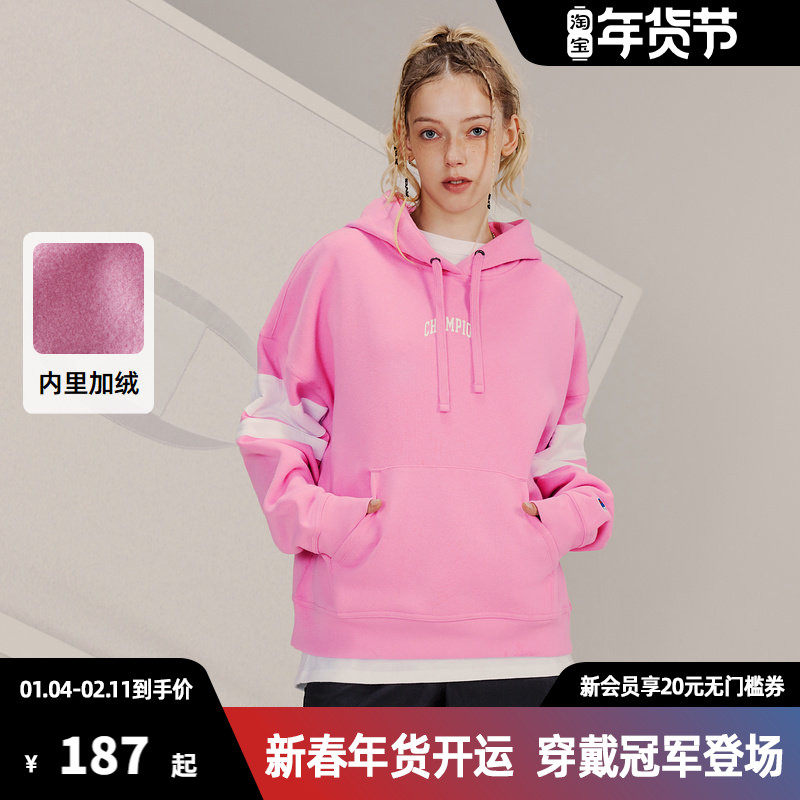 Champion冠军卫衣女25秋季新款胶印LOGO侧袖拼色连帽加绒休闲上衣