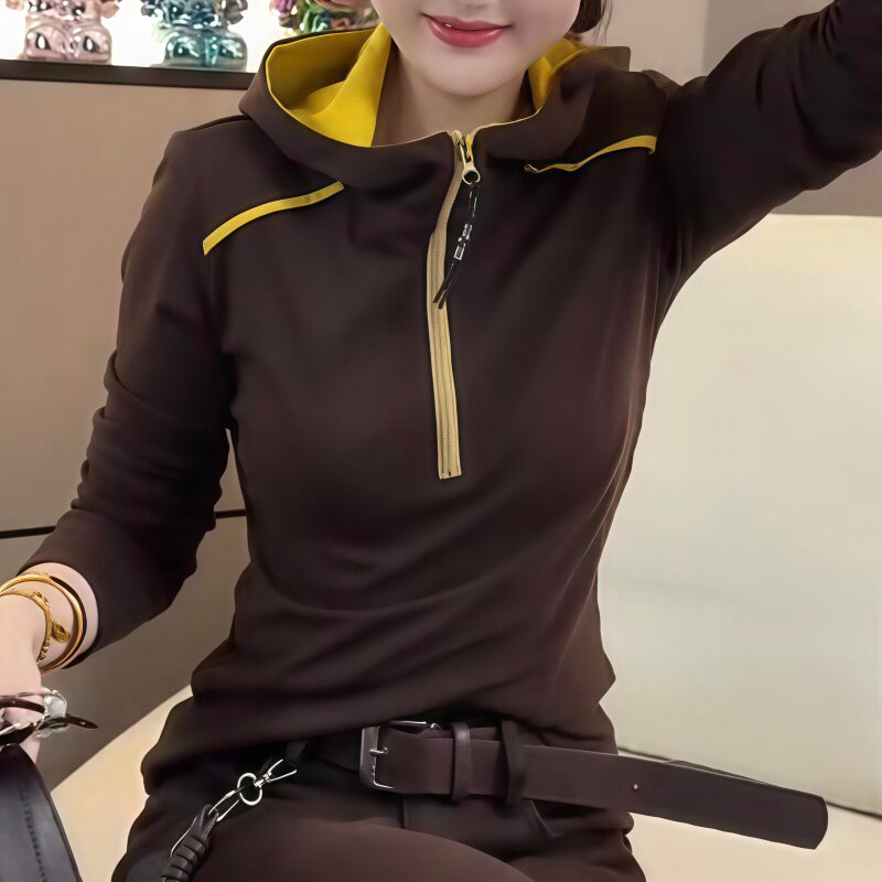 时尚休闲拼色半拉链连帽卫衣女2025秋冬新款洋气减龄长袖显瘦上衣