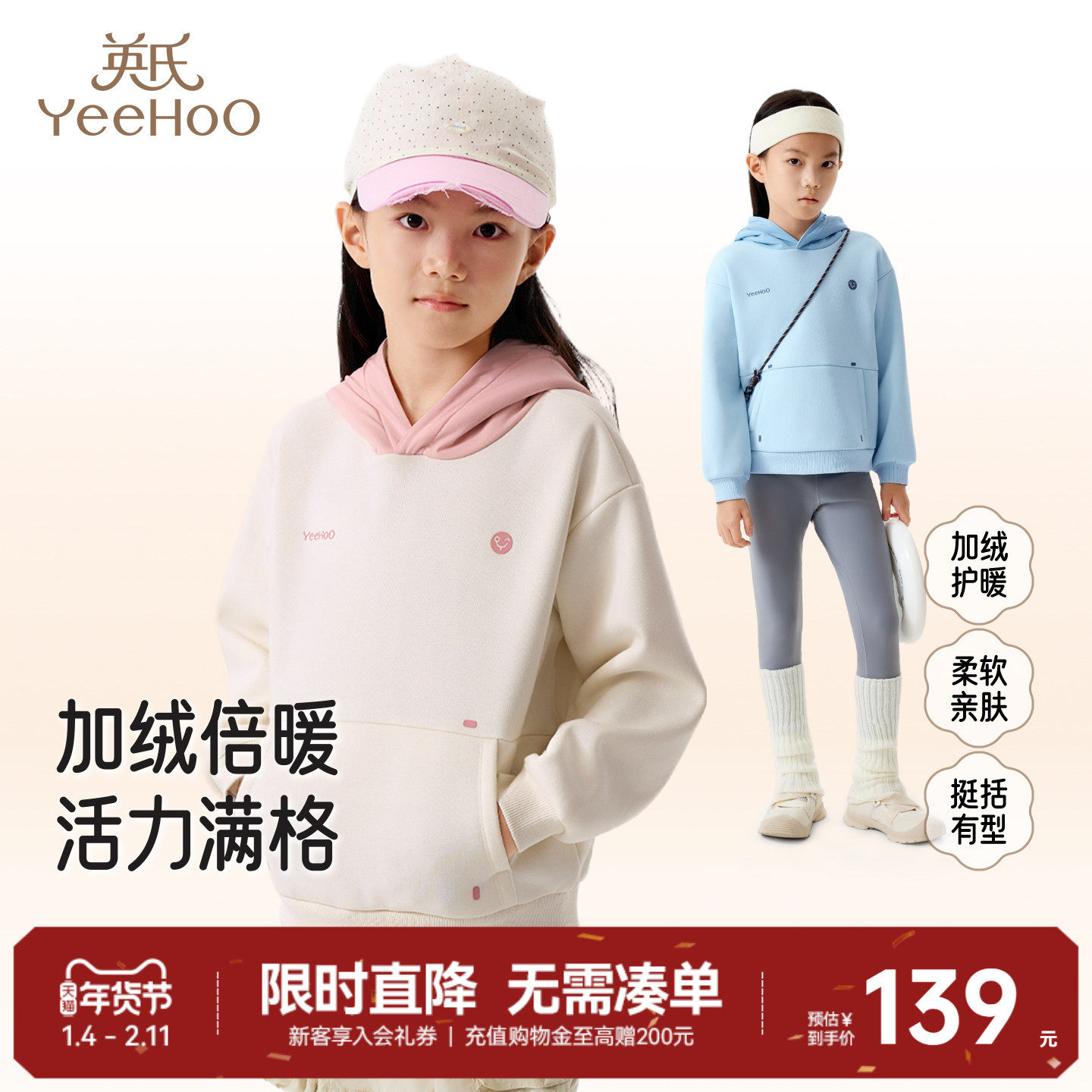 英氏儿童连帽卫衣针织绒衫女童女宝秋冬时尚加绒保暖潮流拼色新款