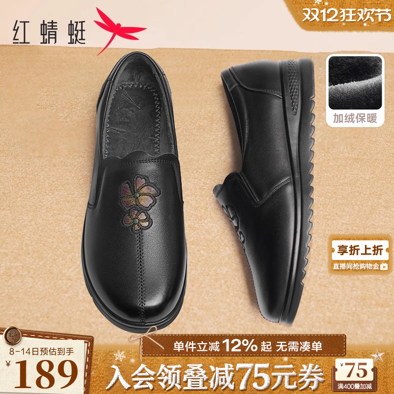 红蜻蜓皮鞋女妈妈鞋秋冬真皮软底中老年鞋子舒适平底加绒奶奶单鞋