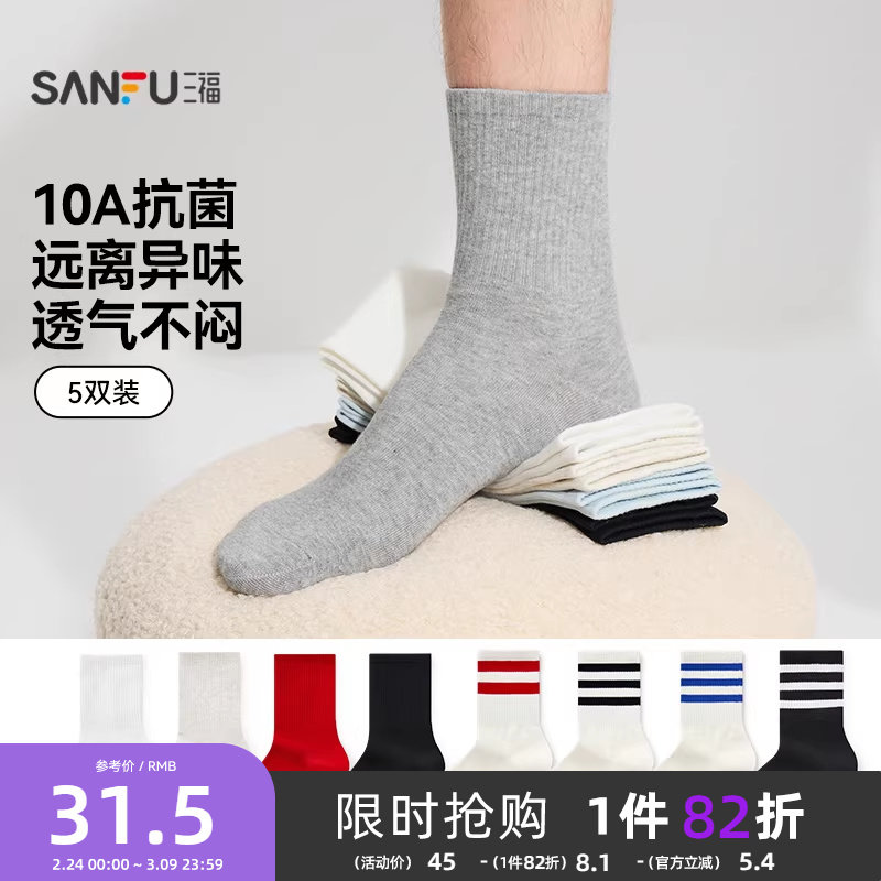 三福【5双装】男士短筒袜净色抗菌精梳棉男袜男生短袜袜子472786