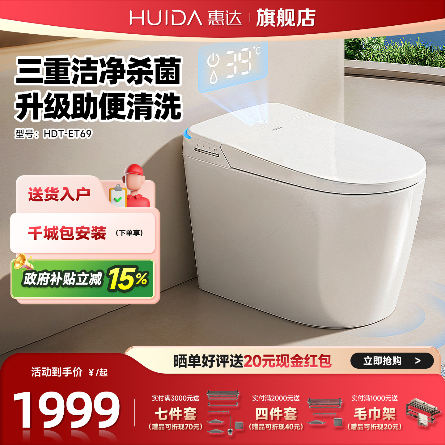 惠达智能马桶全自动一体式家用坐便器泡沫盾除臭杀菌妇洗助便ET69