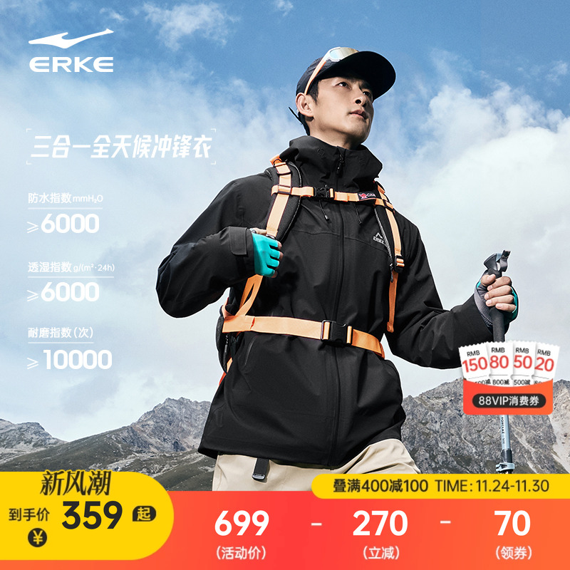 鸿星尔克三合一冲锋衣男冬季新款男士户外硬壳加厚防水防风衣外套