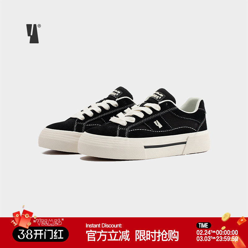VEEMES黑色反毛皮情侣休闲板鞋 街头潮流滑板鞋男鞋女鞋厚底增高