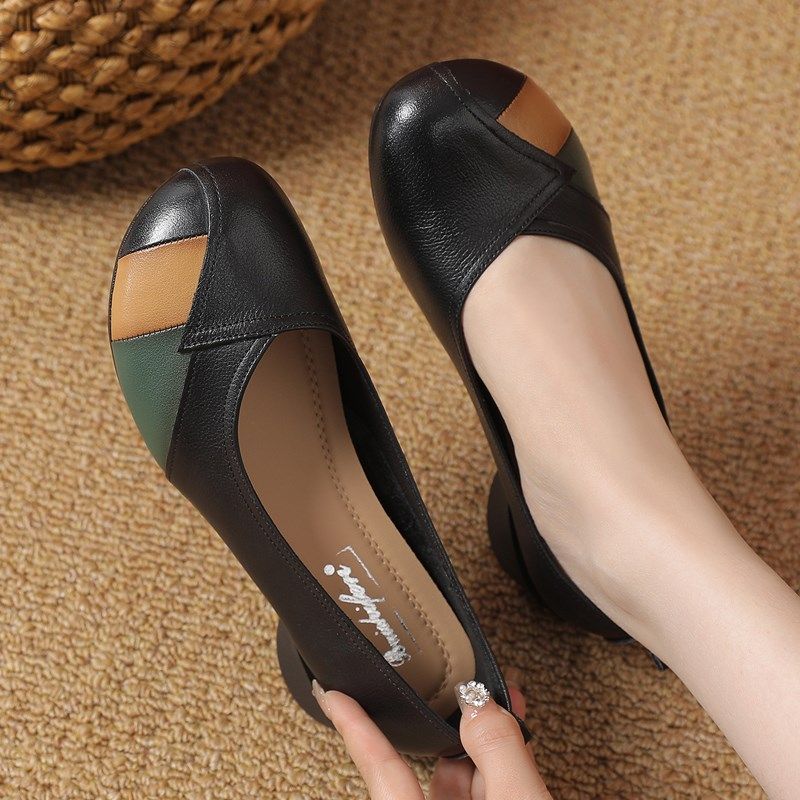 - 尖头浅口粗跟真皮单鞋