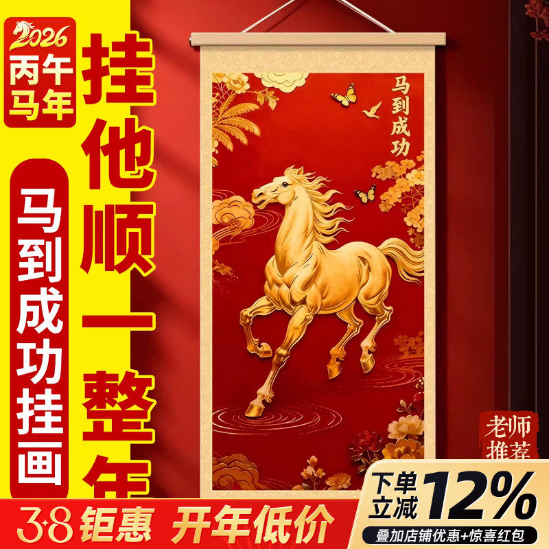 2026中式风马到成功装饰画客厅卧室挂画红色梅花金色骏马布卷轴画