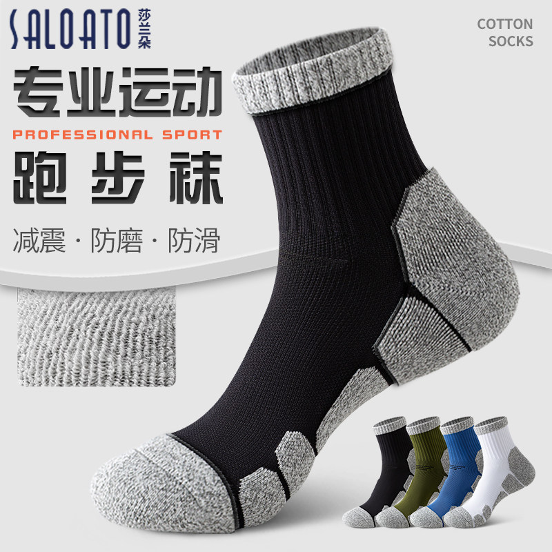 专业马拉松跑步袜子男款中筒纯棉防臭男士加厚毛巾底羽毛球运动袜