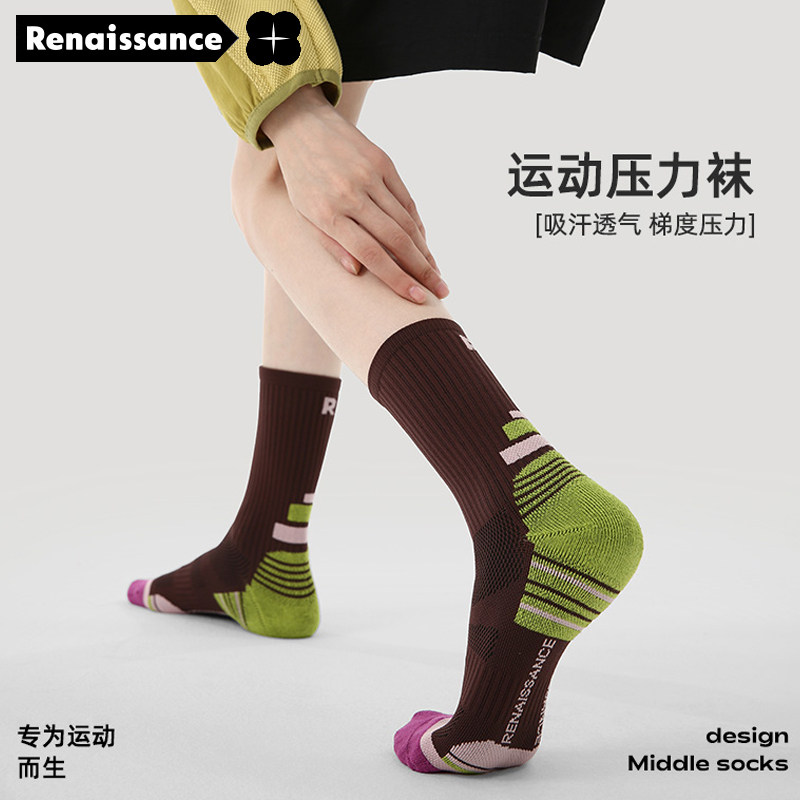 KOM运动袜女中筒袜双杠压缩老钱风网球袜健身训练马拉松跑步袜子
