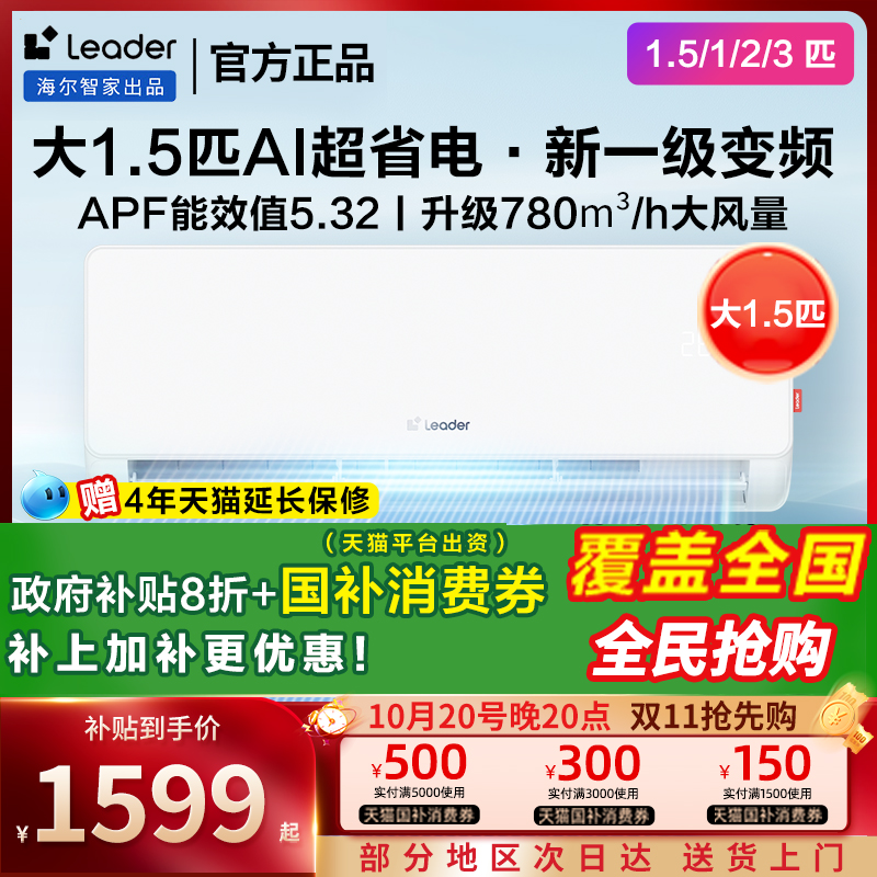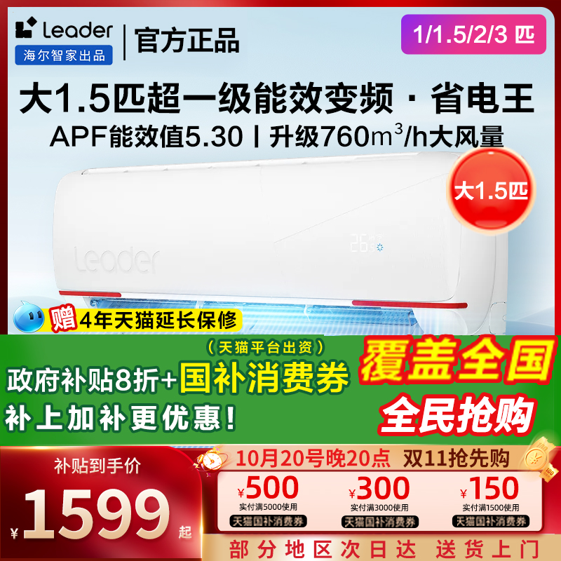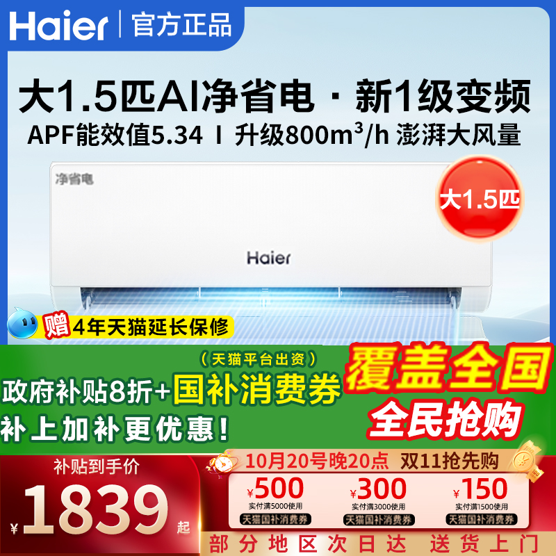 海尔家用3匹壁挂式空调一级能效挂机雷神2/1.5匹政府补贴家电入口
