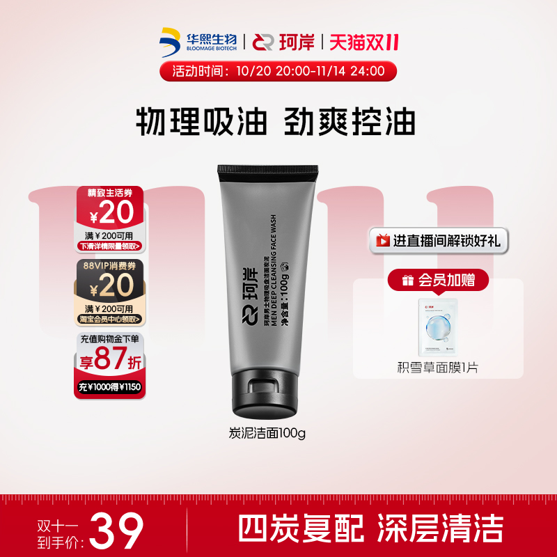 华熙生物珂岸男士洗面奶物理吸盘洁面控油清洁祛黑头炭泥洁面男士