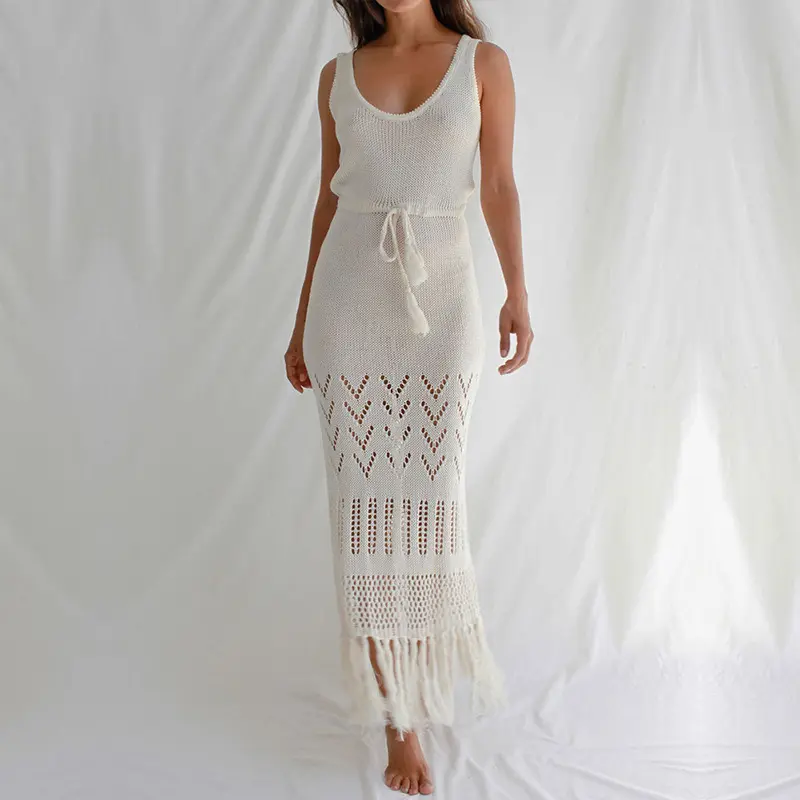 2025秋冬新款沙滩裙纯色性感露背针织镂空连衣长裙比基尼泳衣罩衫