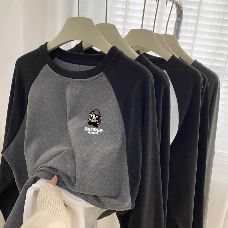 德绒圆领打底衫男士秋冬季加绒加厚保暖宽松内搭拼色长袖T恤上衣