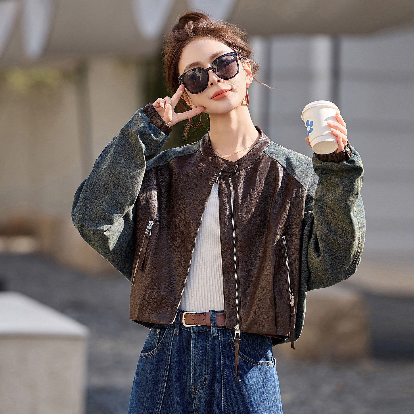港风牛仔拼接皮衣外套女短款2026年春秋新款宽松显瘦百搭PU皮夹克