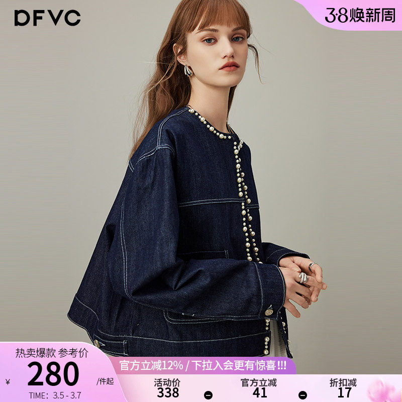 dfvc韩版短款牛仔外套女2026年春季新款珍珠明线圆领休闲显瘦夹克