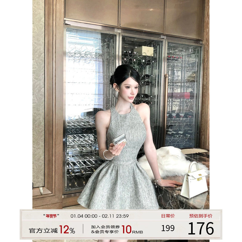 灰尘邓邓 法式挂脖连衣裙女2025冬季新款无袖a字短裙气质露背裙子
