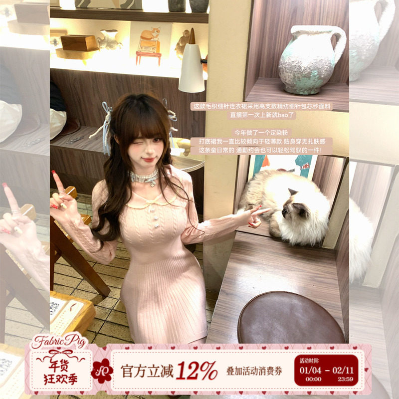 织物猪 粉红少女 甜美风长袖针织连衣裙女早春修身显瘦百搭短裙子