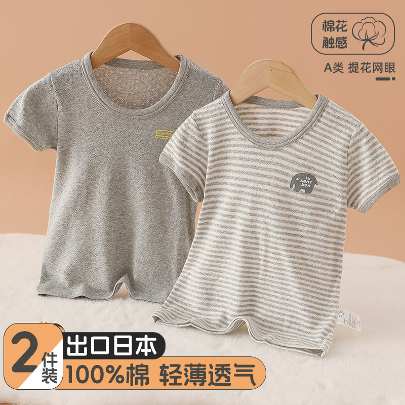日系网眼男宝宝短袖T恤透气条纹上衣100%纯棉儿童学生半袖打底衫