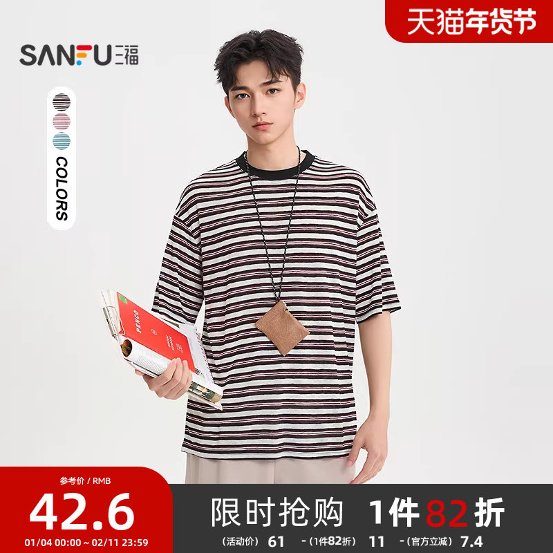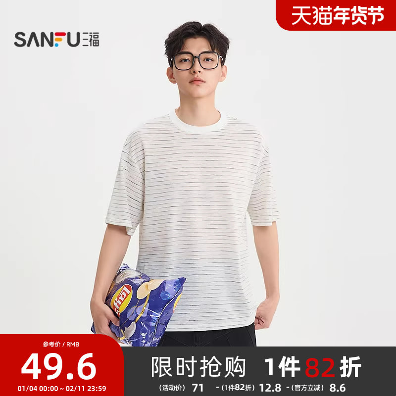 三福2026夏季新款短袖t恤男彩色花纱条纹休闲宽松圆领半袖打底衫