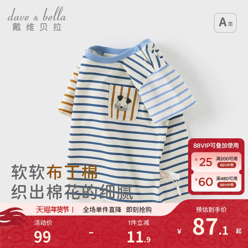 戴维贝拉儿童短袖T恤2026男童夏装新款纯棉打底衫男宝宝条纹上衣