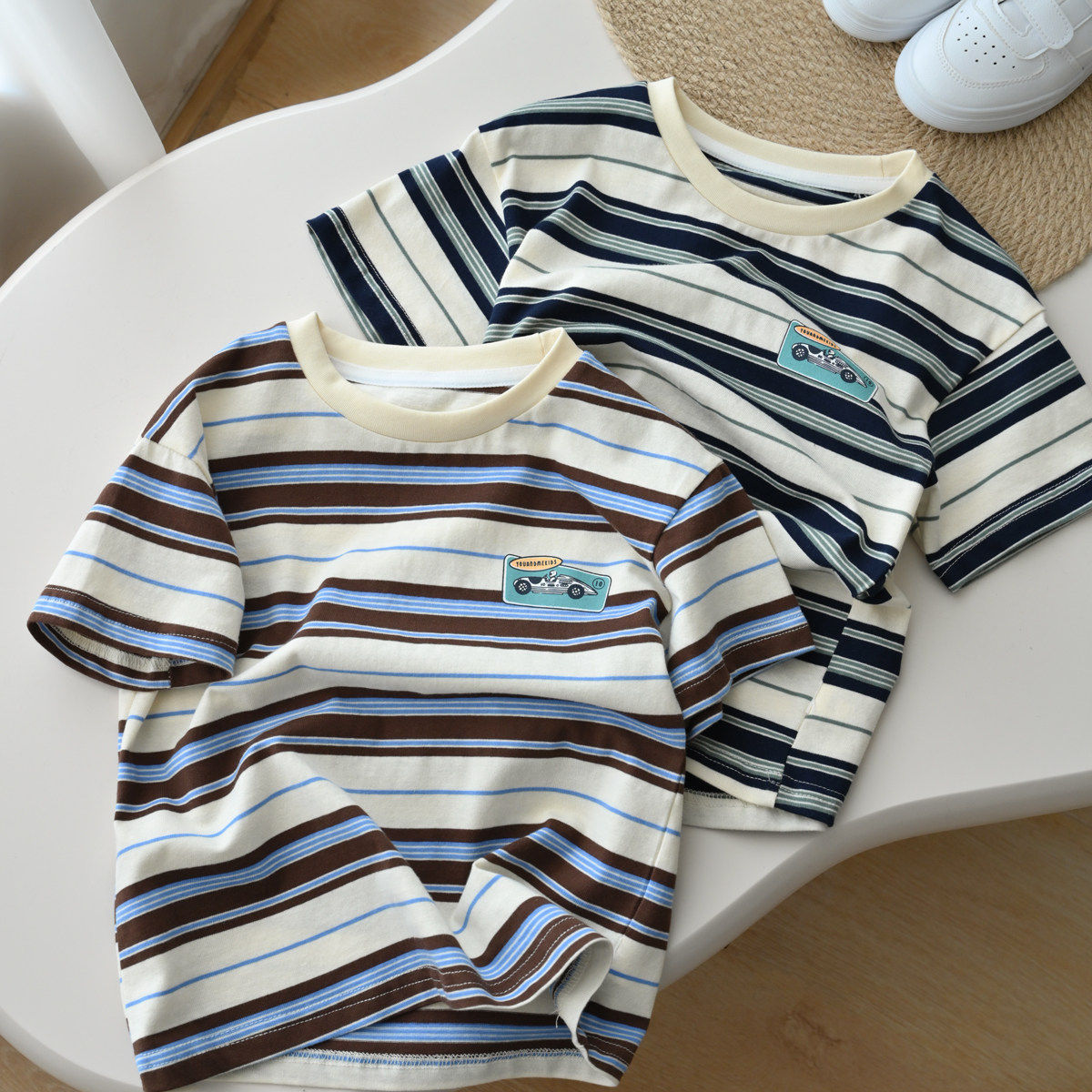 特 儿童纯棉条纹T恤 男童圆领全棉汽车短袖上衣打底衫 中大童