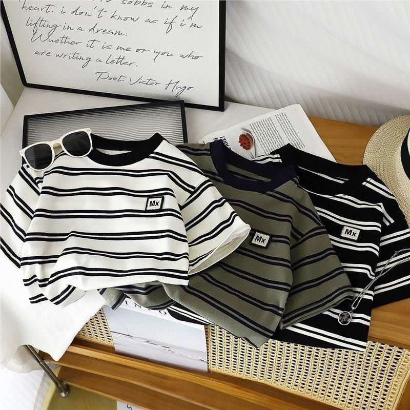 ins韩版夏装儿童条纹圆领T恤薄款短袖打底衫男女宝宝上衣婴儿衣服