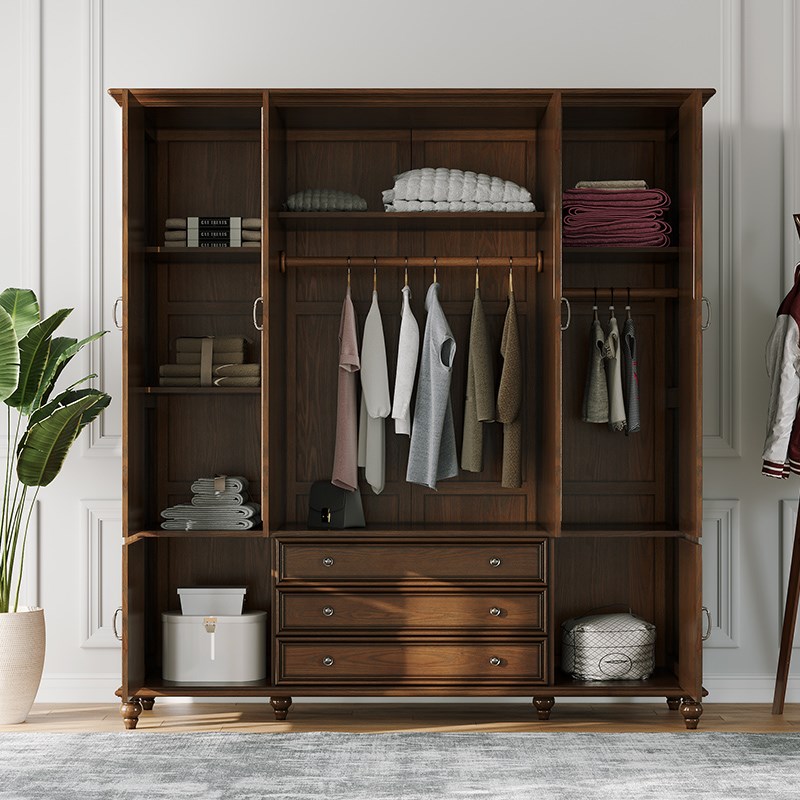 复古美式实木卧室大衣柜三四五六开门可加顶柜中古风家用储物衣橱