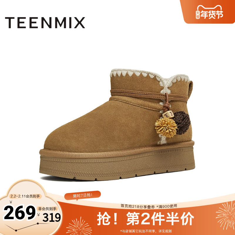 天美意复古厚底加绒保暖勃肯毛毛鞋棉鞋女雪地靴休闲短靴冬季新款