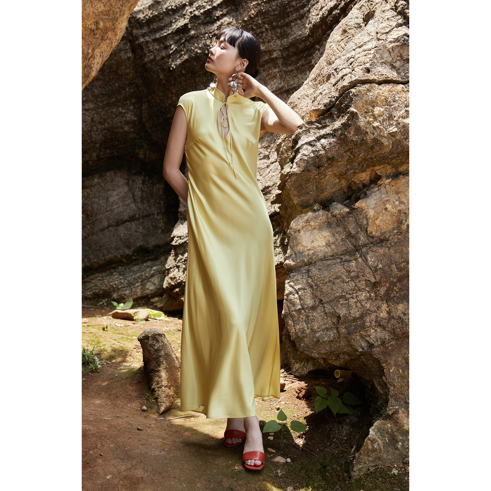 PaleBlueDot蓝点【夏日时髦】设计师立领亮黄色缎面旗袍连衣裙女