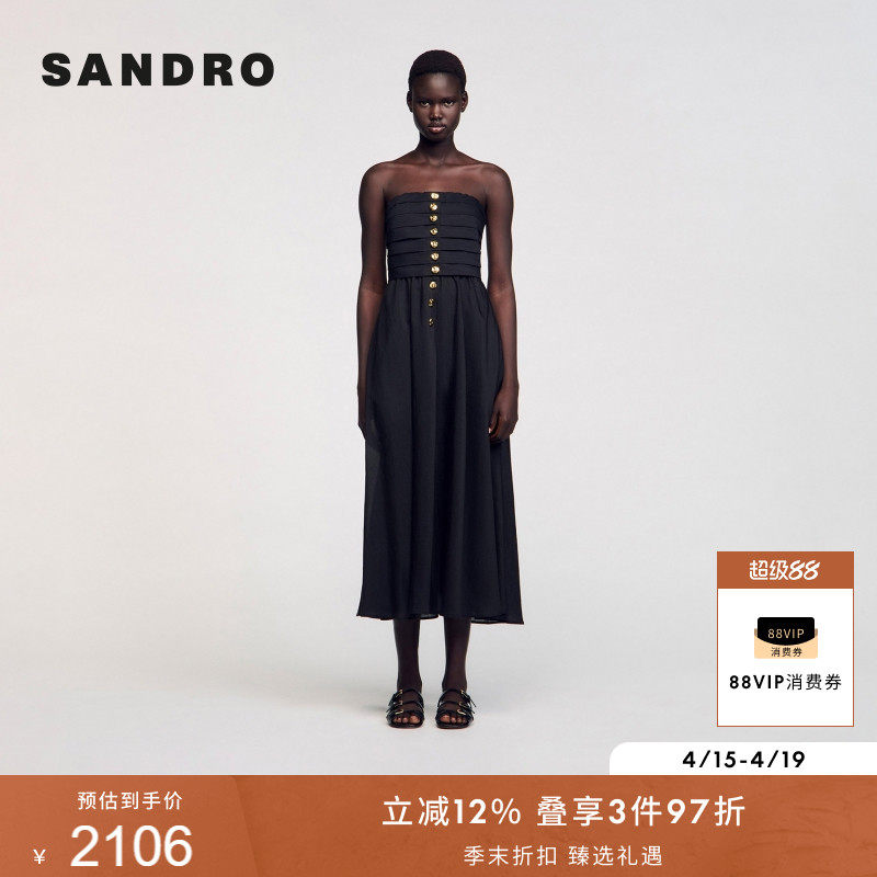 SANDRO2025春夏女装法式优雅A字裙摆亮色扣饰黑色抹胸长款连衣裙